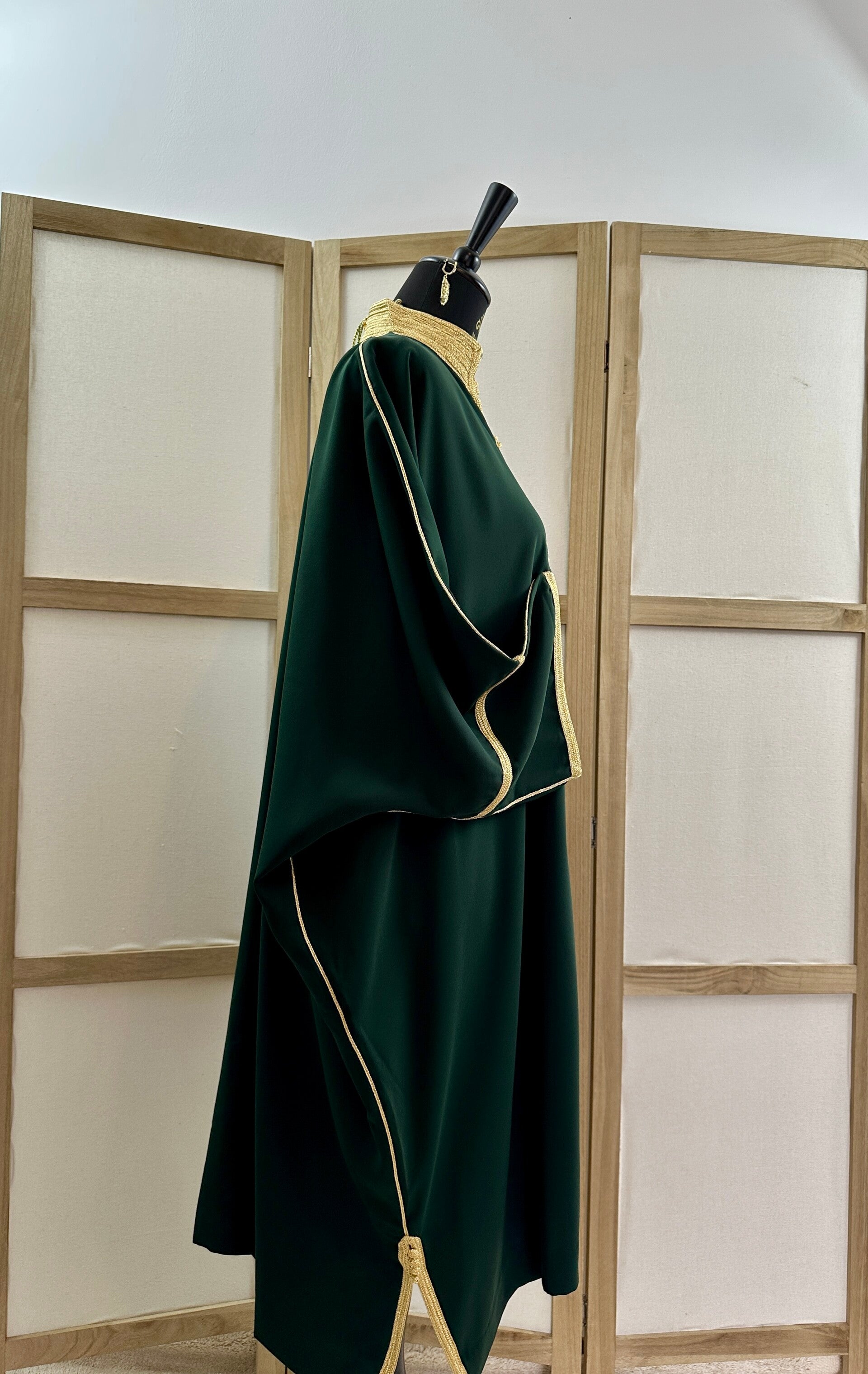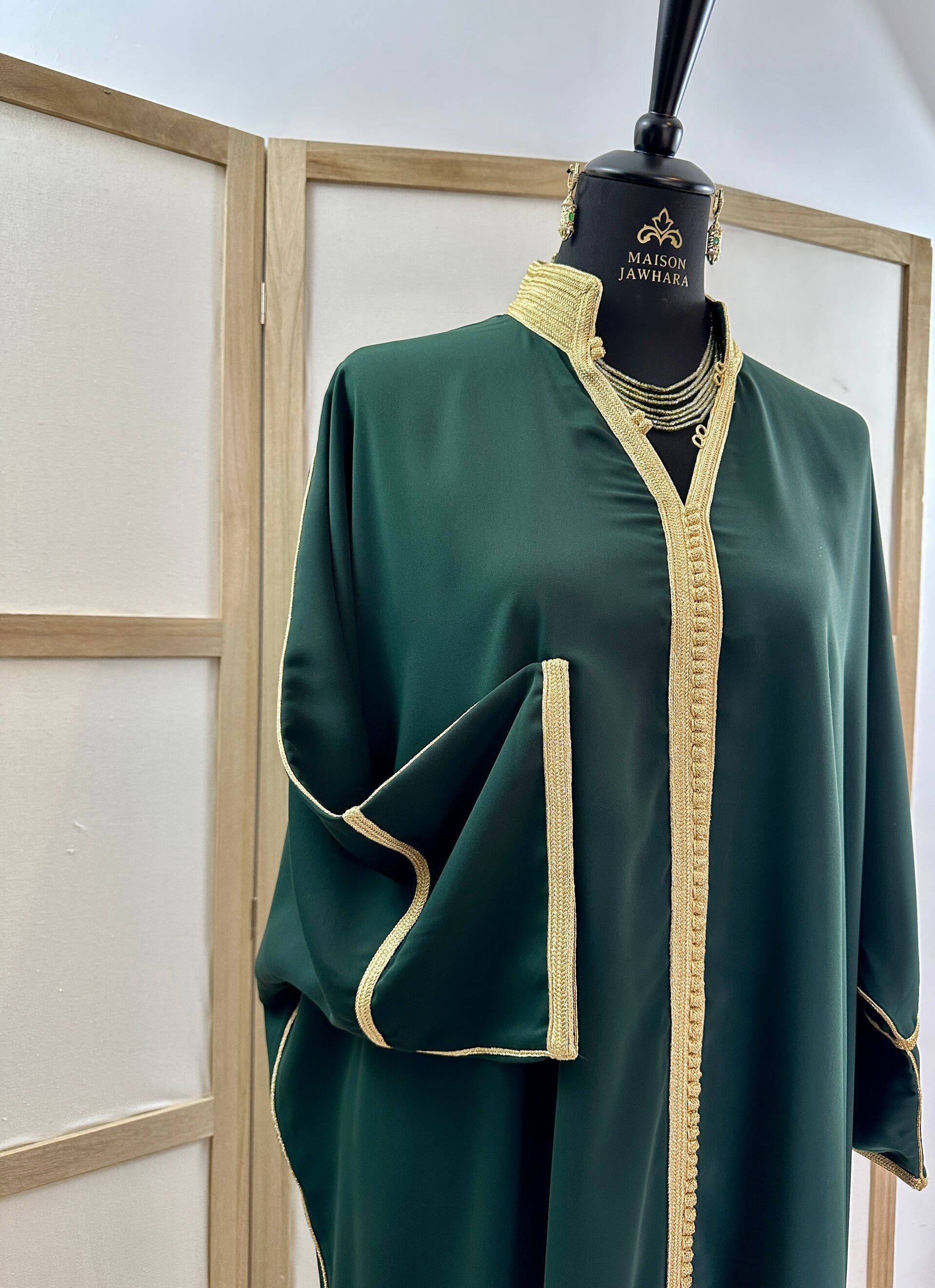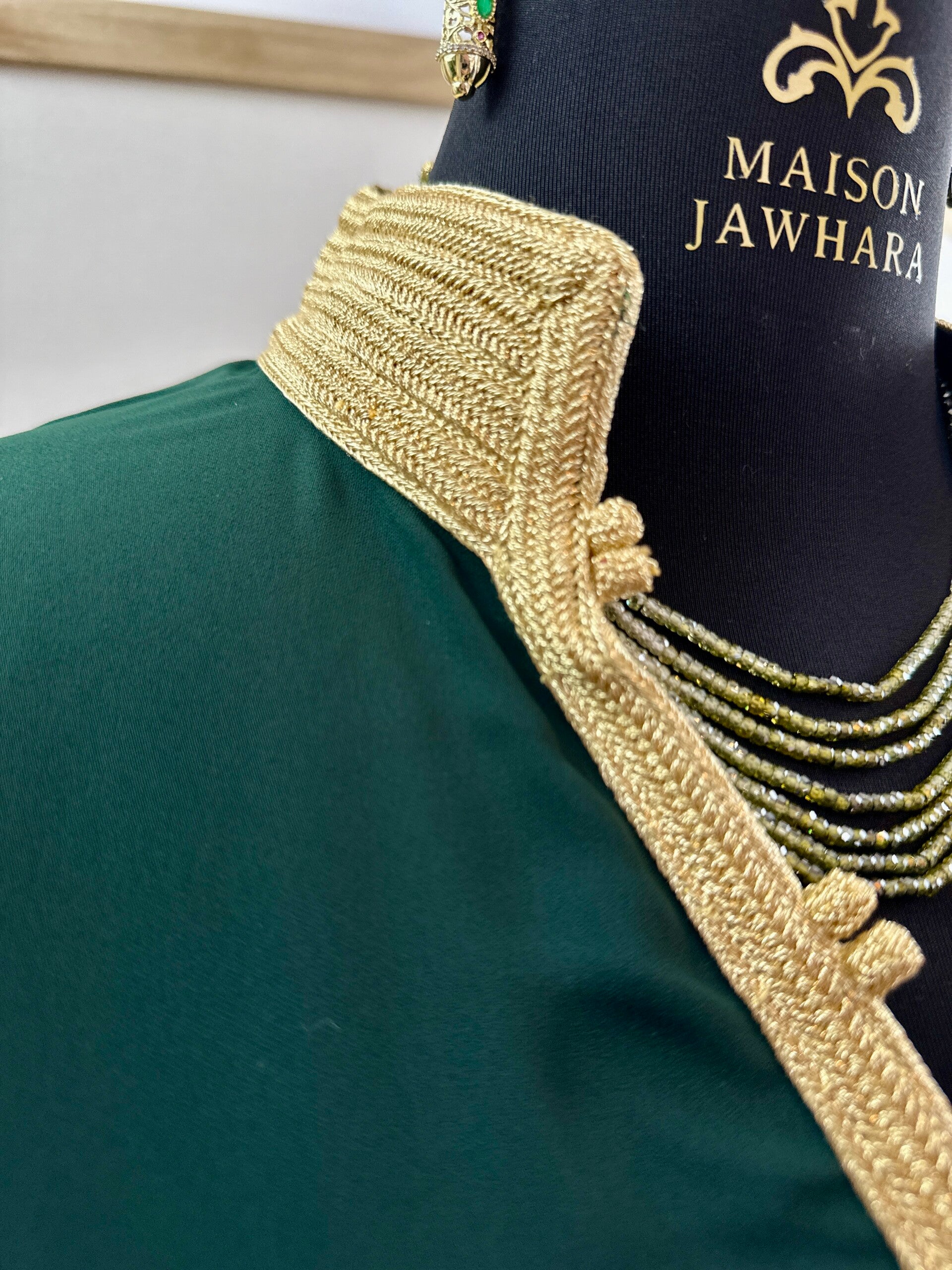 Ses finitions: un galon de soie (sfifa), des boutons traditionnels réalisés à la main (aakads) et enfin un travail minutieux du cordon fin (katan).
